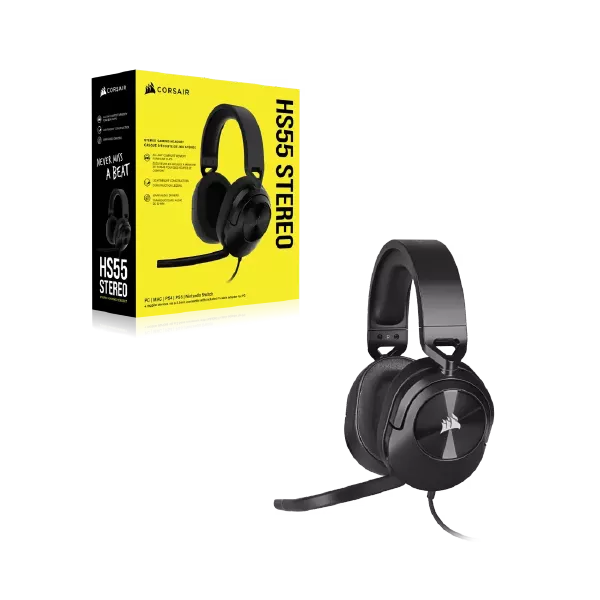 The CORSAIR HS55 STEREO Gaming Headset delivers essential all-day comfort and sound quality with memory foam leatherette ear pads, lightweight construction, and custom-tuned 50mm neodymium audio drivers.